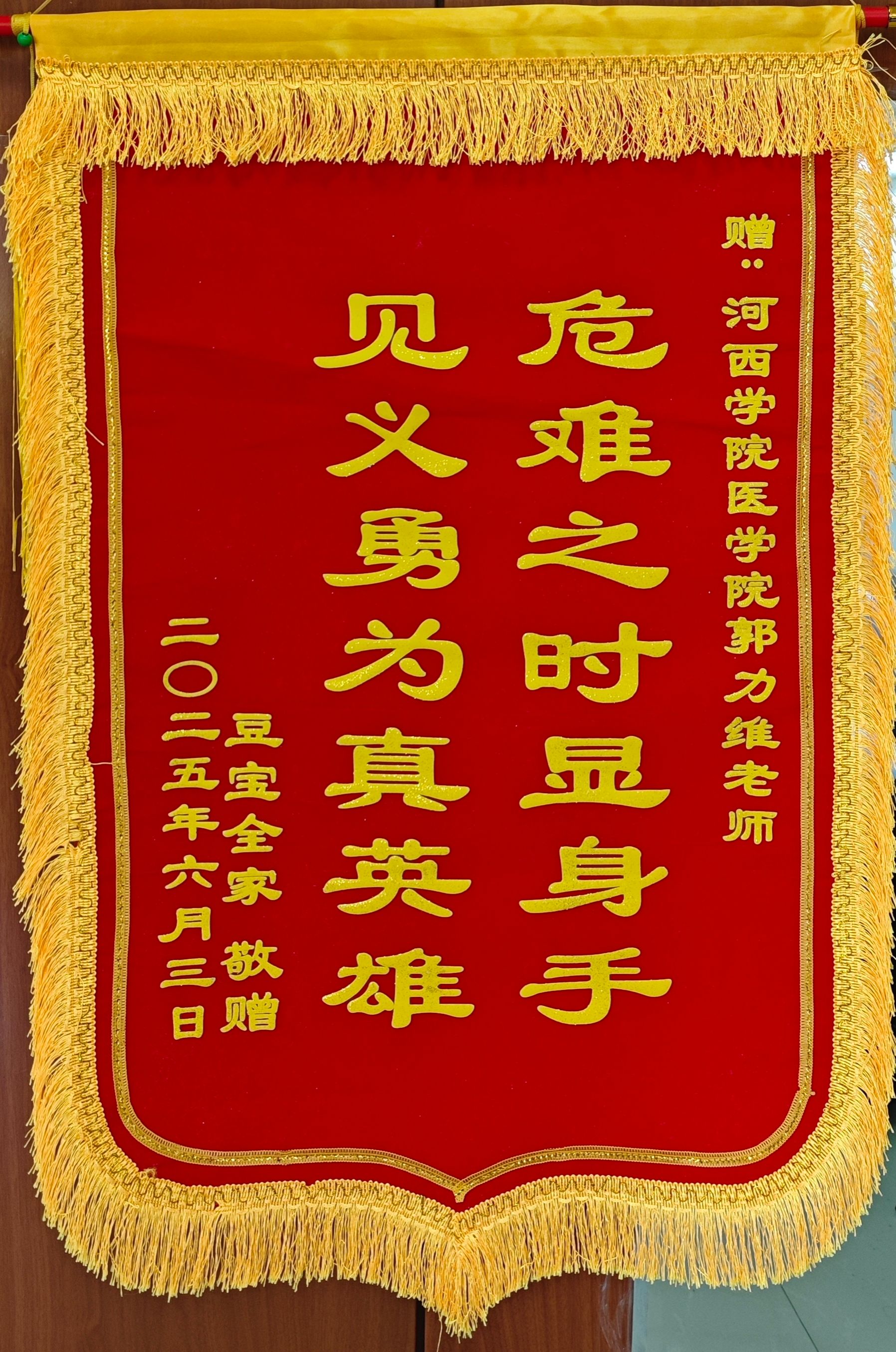 6月1日下午,在张掖市上秦山丹河流域,3522vip浦京集团官网生理教研室教师郭力维外出休假时,突然发现一名4岁女童不慎滑入湍急的河水中。由于水流湍急,女童瞬间被冲出数米远,仅剩头部在水面时隐时现,随时可能被急流吞没。危急时刻,郭力维不顾个人安危,毫不犹豫跳入河水中,迎着激流奋力将女童救起。上岸后,他运用医学专业急救知识检查女童状况,确认无碍后就悄然离开了。据悉,获救女童父母当时只知道救孩子的是一个身材高大的河西学院老师。事后被救儿童父母经过多方打听才找到3522vip浦京集团官网的郭力维老师,特地制作锦旗并送到学校,向郭老师致以诚挚谢意。
