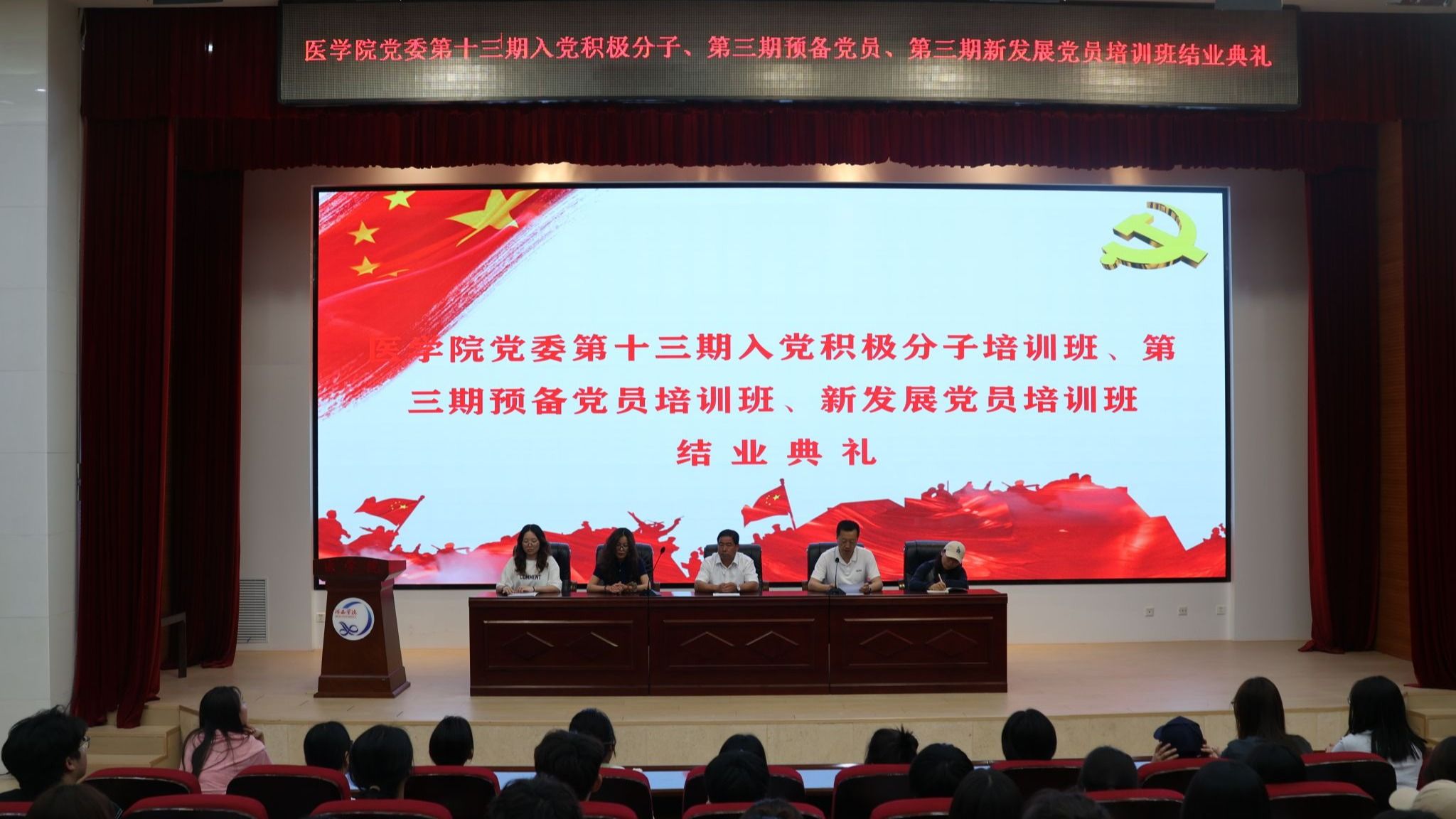 6月13日,学院党委第十三期入党积极分子、第三期预备党员、新发展党员培训班结业典礼在学术报告厅举行。各学生党支部书记、88名入党积极分子、32名预备党员、30名新发展党员,共计150名学员参加。